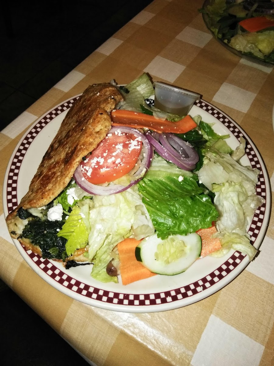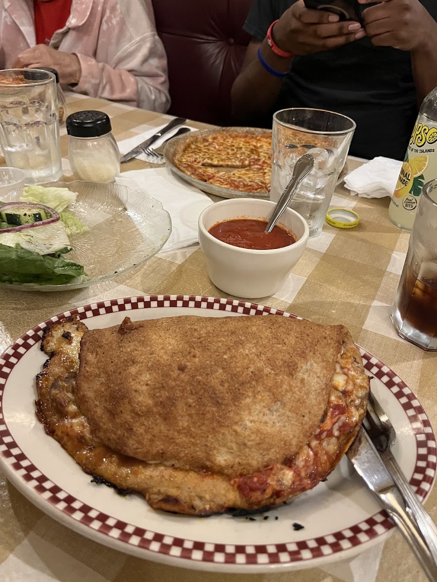 This is my 87 y/o mom’s favorite pizza place. Thin and crispy and well done is her preferred meal with a garden salad with chicken. The salads are fresh, the house dressing is perfect- oil, vinegar & herbs. The calzones my favorite are fantastic! There’s over a dozen to choose from- my fav is the sausage, mushrooms, sauce and cheddar cheese with wheat dough. This spot is a family favorite, neighborhood favorite restaurant with a variety of pasta, salads, sandwiches, calzones and pizzas. The couple sitting next to ours had pasta dishes I couldn’t keep my eyes off of! There’s also a bar with 2 large TVs. It was busy and the waitstaff were working hard.
