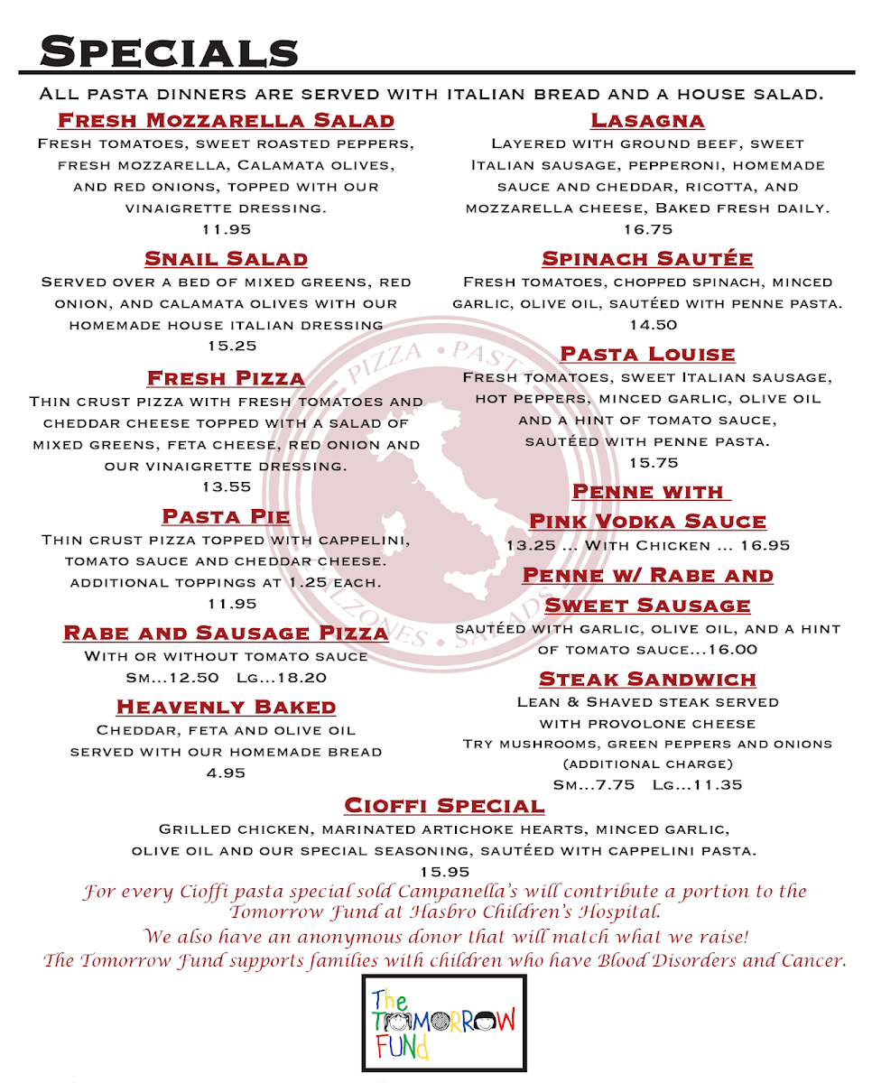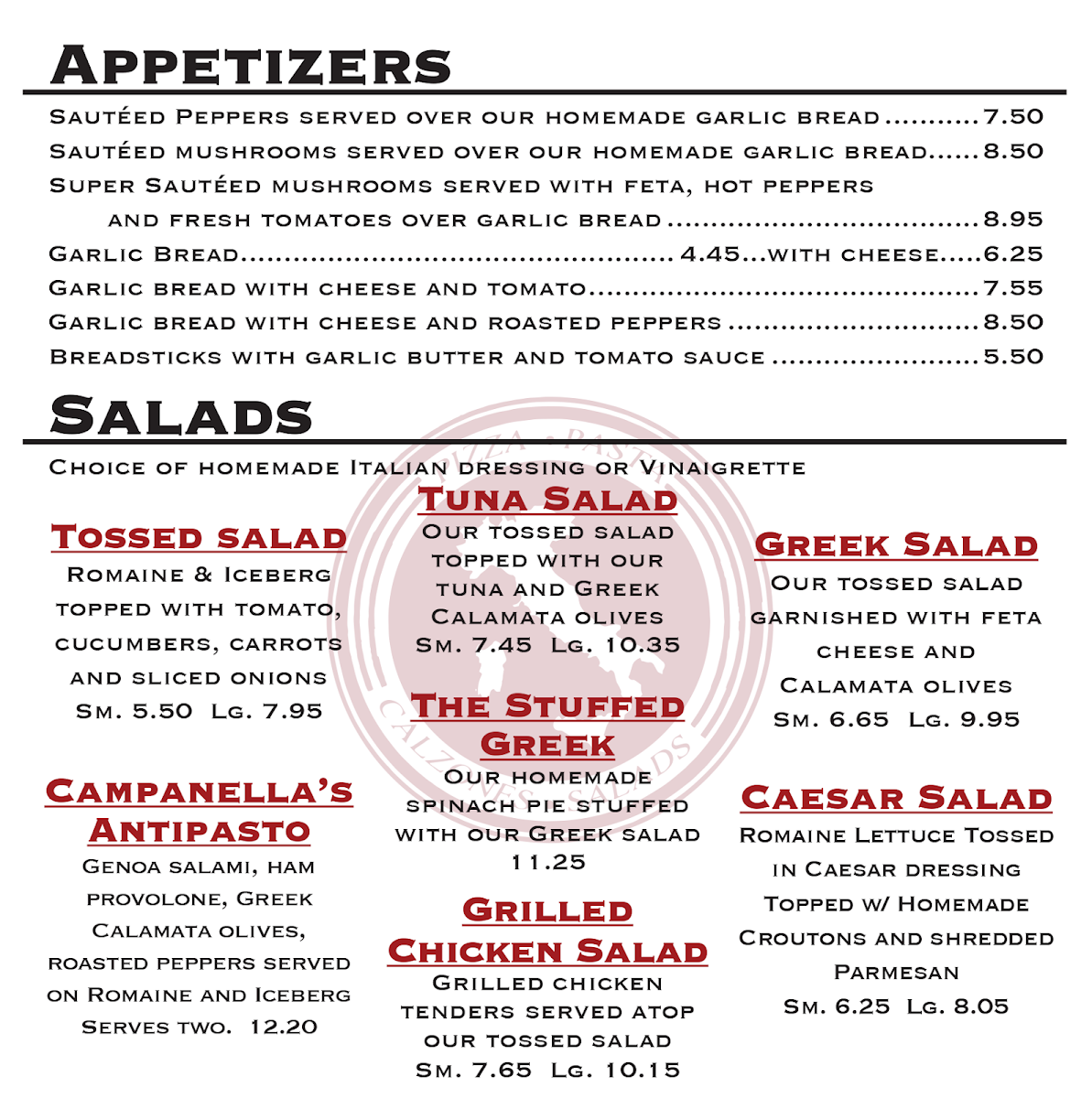 Campanella's menu offers a straightforward and comforting selection that pairs well with its warm, family-friendly atmosphere. This is a place where casual dining turns into a satisfying experience with classic Italian dishes and a variety of hearty pizzas. Whether you're dropping by for a quick slice or settling in for a full meal, the menu strikes a balance between familiar favorites and thoughtfully crafted options.